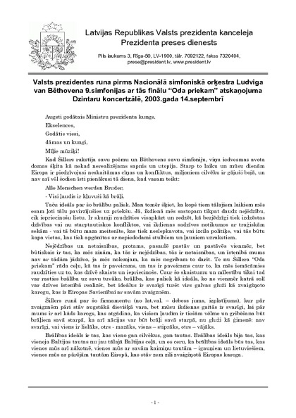 Valsts prezidentes runa pirms Nacionālā simfoniskā orķestra Ludviga van Bēthovena 9.simfonijas ar tās finālu “Oda priekam” atskaņojuma Dzintaru koncertzālē, 2003.gada 14.septembrī