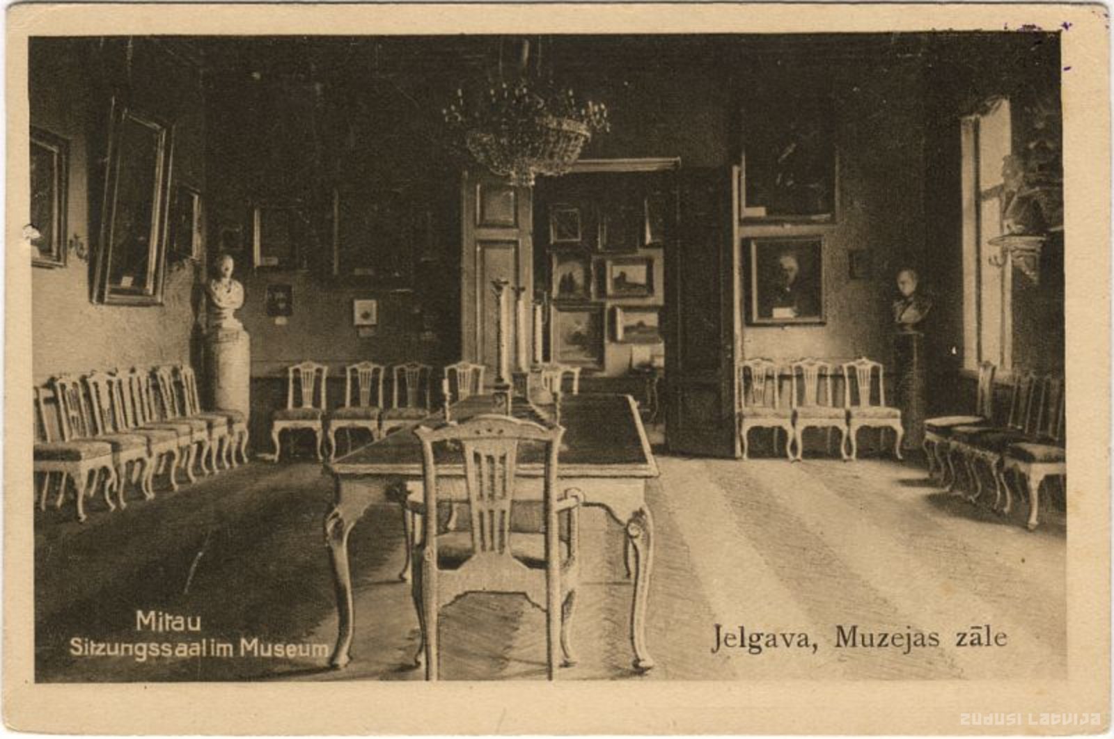 Attēlā redzama Kurzemes provinces Muzeja sēžu zāle. Kurzemes provinces muzeju dibināja Kurzemes Literatūras un mākslas biedrība (dibināta 1818.gadā). Muzeja krājumos ietilpa ne tikai attēlā redzamie vēsturiskie portreti, krūšu tēli un antīkās lietas, bet arī materiāli, kas iegūti izrakumos, minerāli, meteorīti, apbalvojumi utt. Muzejs sākotnēji atradās spiestuves telpās, taču 1898.gadā tam tika uzcelta ēka Muzeja lukumā (pie tirgus laukuma). 1935.gadā Latvijas Valsts konfiscēja muzeja krājumus un nodeva Valsts arhīvam biedrības un muzeja arhīvu kolekcijas. Kurzemes provinces muzeju likvidēja pēc vācbaltu repatriēšanās 1940.gadā un muzeja kolekcijas nodeva Valsts Vēsturiskā muzeja īpašumā, kuras pēc nepilniem diviem mēnešiem padomju varas iestādes pasludina par nacionalizētām. II Pasaules kara laikā (vācu okupācijas laikā) 1943.gadā, tika pat atzīmēta Kurzemes Provinces muzeja dibināšanas 125.gadadiena. Taču pēc 1944.gada vasaras cīņas par Jelgavu muzeja ēka tika sagrauta, daļa no fondiem - izvesta uz Vāciju (tika atgūra 20.gs. 50.gados), daļa pazuda vai gāja bojā. Līdz mūsdienām nonākušās senlietas no Kurzemes provinces muzeja fondiem glabājas Ģ. Eliasa Jelgavas Vēstures un mākslas muzejā.