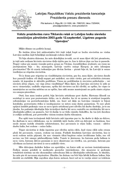 Valsts prezidentes runa Tikšanās reizē ar Latvijas lauku sieviešu asociācijas pārstāvēm 2003.gada 12.septembrī, Līgatnes pagasta “Upmaļos”