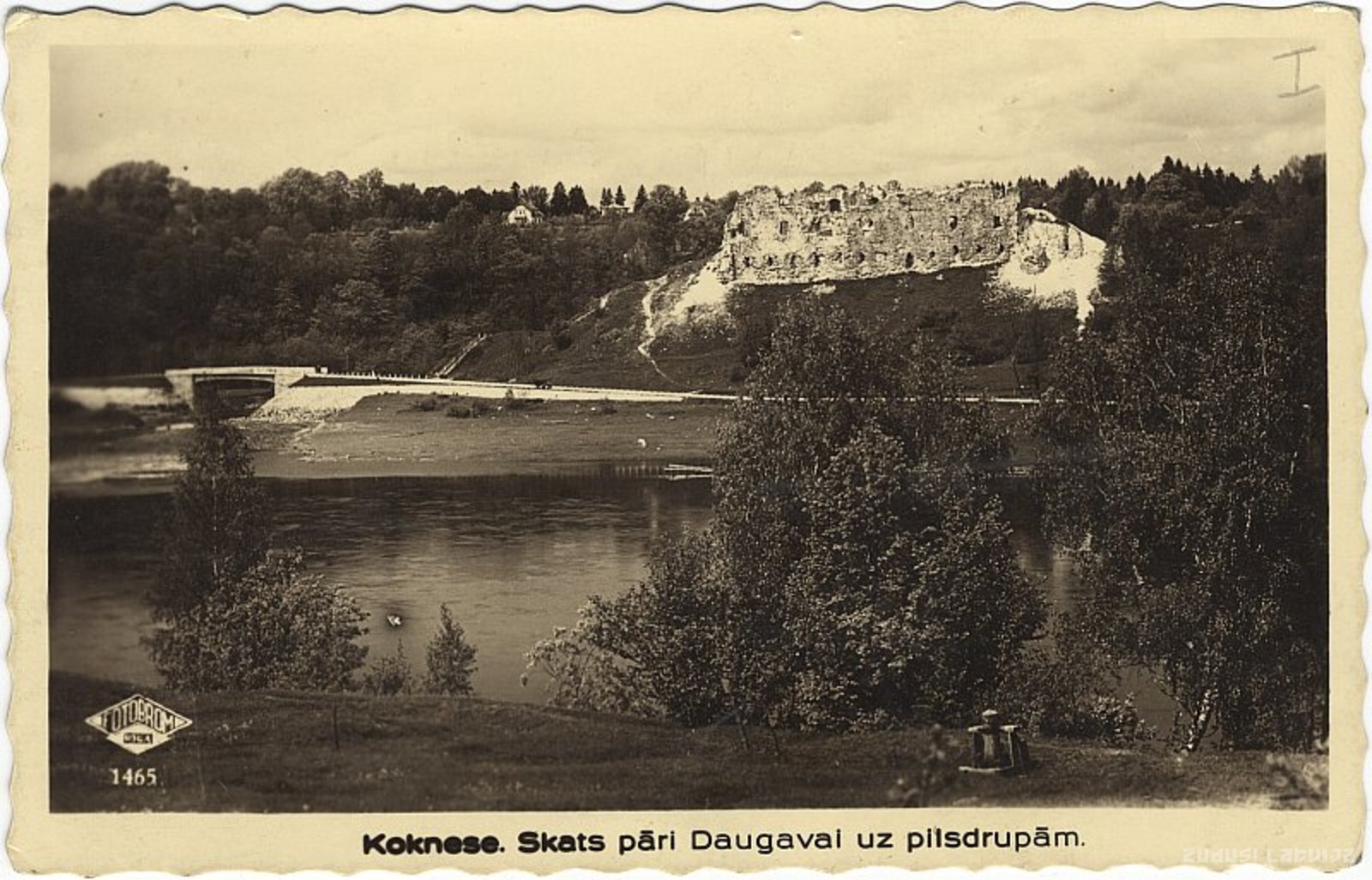 Valsts nozīmes kultūras piemineklis Kokneses pils bijusi Rīgas bīskapa, arhibīskapa un vasaļu pils. Pils celta uz senākā latgaļu pilskalna 13. gs. sākumā, kad tur valdīja Vesceke. Vesceke pats nodedzināja savu pili, kad uzbruka vāciešiem un devās prom uz Krievzemi. 1209. gadā bīskaps Alberts lika Kokneses nocietinājumus atjaunot, rezultātā uzceļot varenu pili. 1255. gadā pāvests Aleksandrs IV apstiprināja Koknesi kā arhibīskapam piederošu pili. Pilij bija vairāki lēņa turētāji. 13. gadsimtā pie pils sāka veidoties pilsapmetne, kurai 1277. gadā tiek apstiprinātas pilsētas privilēģijas. Kopš 1397. gadā arhibīskaps Johans V no Valenrodes paturēja visu pili tikai sev. Koknese pils kļuva par vienu no arhibīskapa galma pilīm, kurā viņš ar savu galmu uzturējās vasarās. 15. gadsimtā arhibīskaps pilī veica pārbūves darbus, uzcēla torni - t.s. Garo Heningu. Kad sabruka Livonijas valsts, Koknese ar tās pili nonāca Polijas pakļautībā. 17. gadsimtā pili vairākkārt iekaroja gan zviedri, gan poļi. Zviedri Koknesē valdīja līdz 1656. gadam, kad tos padzina krievu karaspēki, kuri sāka tur ierīkot eksportpreču centrālās noliktavas. Tomēr jau 1661. gadā Koknesē atkal valda zviedri. 17. gs. otrajā pusē daudzo karu rezultātā Koknese panīka. 1701. gadā pēc Spilves kaujas tika uzspridzināti abi Kokneses pils rietuma torņi. Kopš šā laika pils vairs netiek apdzīvota. Kopš 19. gadsimta beigām - 20. gadsimta sākuma Kokneses pilsdrupas kļuva par vienu no populārākajiem tūrisma objektiem Latvijā. Pēc tam, kad tika uzpludināta HES ūdenskrātuve, ūdens līmenis pacēlās līdz pils pamatiem, tādēļ un 20. gadsimta 90. gadu beigās tika veikti pils pamatu stiprināšanas darbi. Vienlaicīgi notika pils virsējo mūra daļu atrakšana un konservēšana. Attēlā redzams arī 1935. gadā celtais 40,10 m garais tilts pār Pērses upi, tas tika uzspridzināts Pļaviņu HES izveidē.