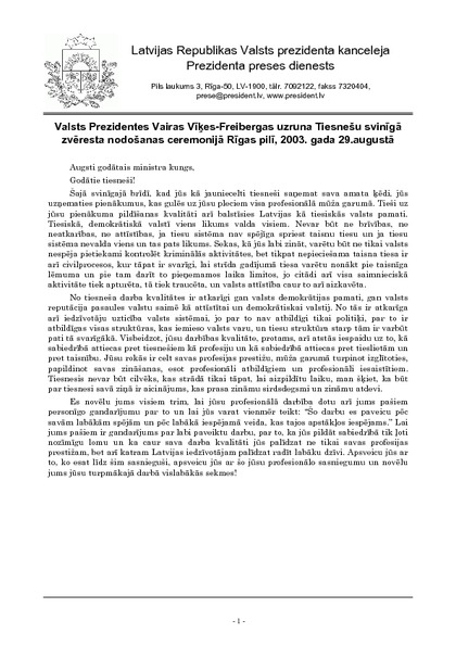 Valsts Prezidentes Vairas Vīķes-Freibergas uzruna Tiesnešu svinīgā zvēresta nodošanas ceremonijā Rīgas pilī, 2003. gada 29.augustā