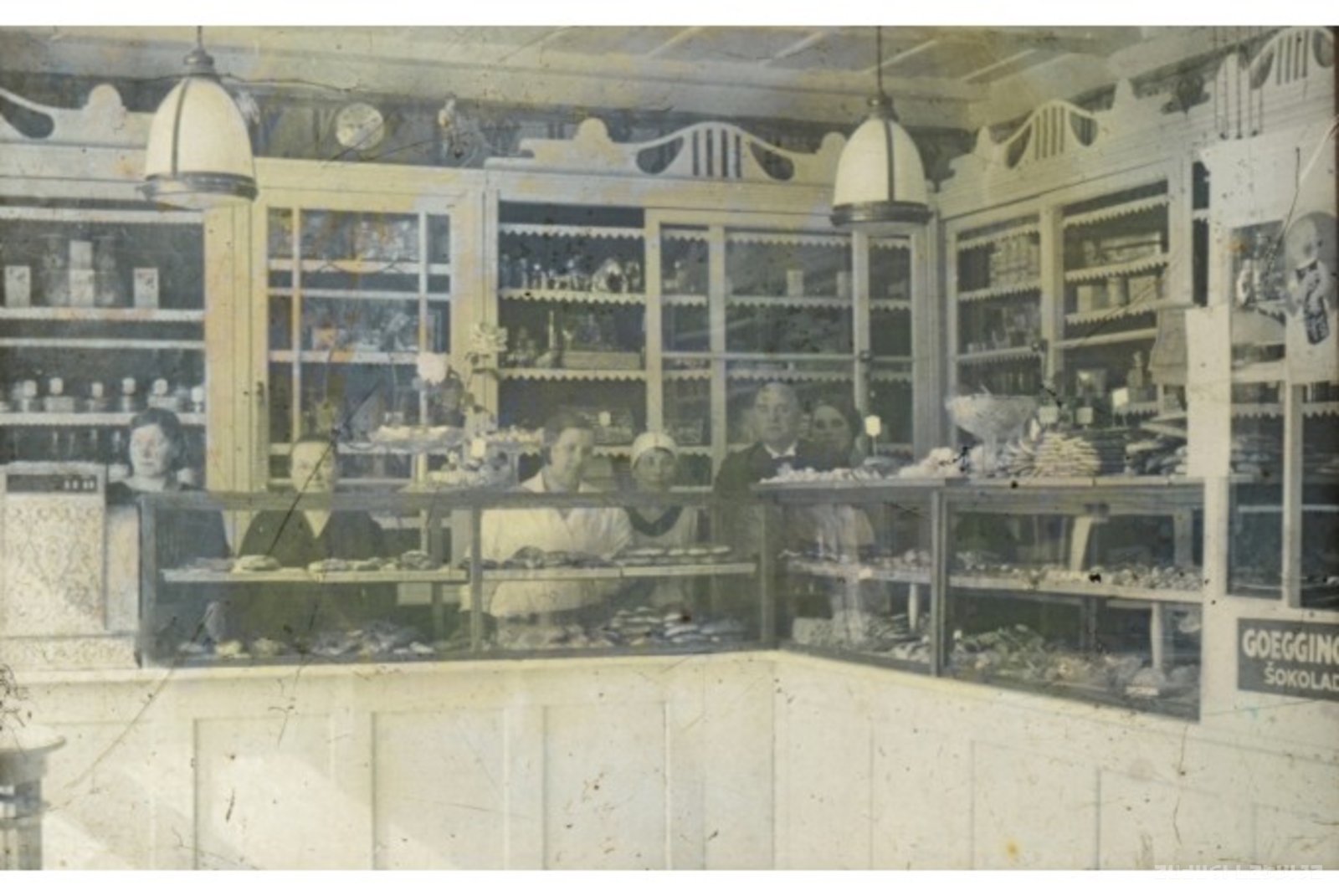 Ķuzes saldumu veikala iekšskats ar pārdevējiem