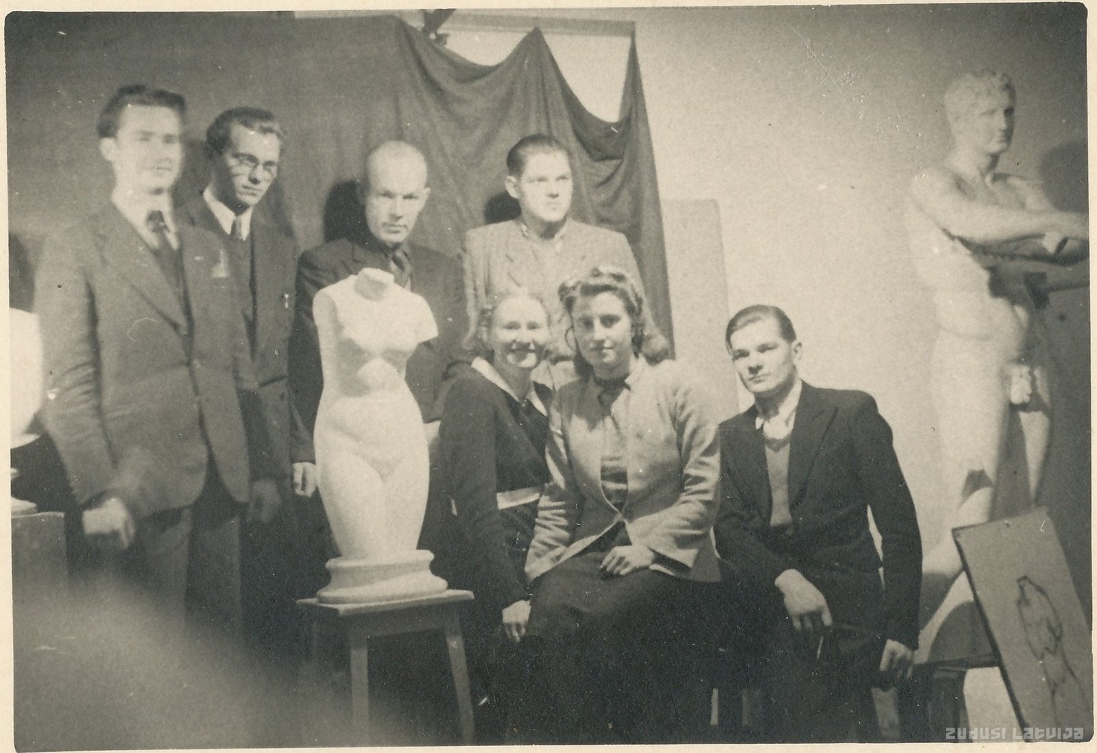 LU arhitektūras fakultātes studenti zīmēšanas studijā universitātes centrālās ēkas bēniņos. 1944.gada pavasaris