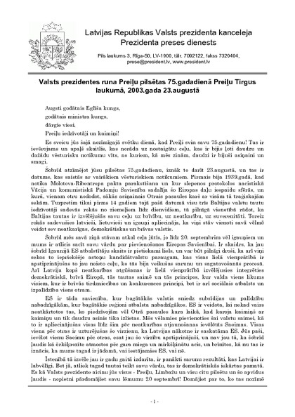 Valsts prezidentes runa Preiļu pilsētas 75.gadadienā Preiļu Tirgus laukumā, 2003.gada 23.augustā