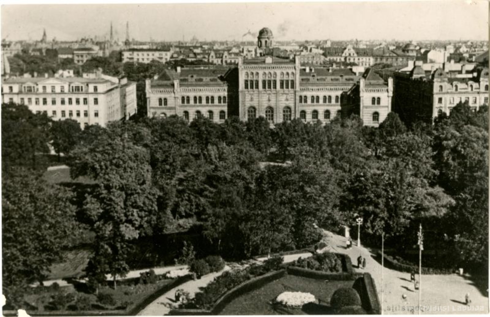 Rīgas Politehnikuma ēkas daļa gar Raiņa bulvāri celta 1866.–1869. gadā pēc arhitekta G. F. A. Hilbiga projekta. Fasādē agrākā Rīgas Politehnikuma fakultāšu simbolika un kādreizējo Baltijas guberņu (Vidzemes, Kurzemes, Igaunijas) un Sāmsalas ģerboņi cinka lējuma ciļņos. Rīgas Politehnikums dibināts 1862. gadā, sākotnēji tas darbojās ēkā Krišjāņa Barona ielā 14, no 1869. gada jaunajā ēkā Raiņa bulvārī. 1896.–1915. gadā augstskolas nosaukums - Rīgas Politehniskais institūts. Līdz 1896. gadam mācības notika vācu valodā, vēlāk, līdz 1. pasaules karam – krievu valodā. No 1919. gada ēkā darbojās Latvijas Augstskola (dibināta 1919. gadā), no 1923. gada tās nosaukums Latvijas Universitāte, 2. pasaules kara vācu okupācijas laikā ar nosaukumu Universitāte Rīgā, padomju okupācijas gados Latvijas Valsts universitāte (1958. gadā nosaukta Pētera Stučkas vārdā). 20. un 30. gados ēka bija LU īpašums. Tajā laikā tur darbojās arī virkne biedrību, t. sk. Latvijas arhitektu biedrība, Latvijas teologu un filozofu biedrība, Kanta biedrība, Tautu savienības veicināšanas biedrība u. c. Tagad tā ir LU galvenā ēka