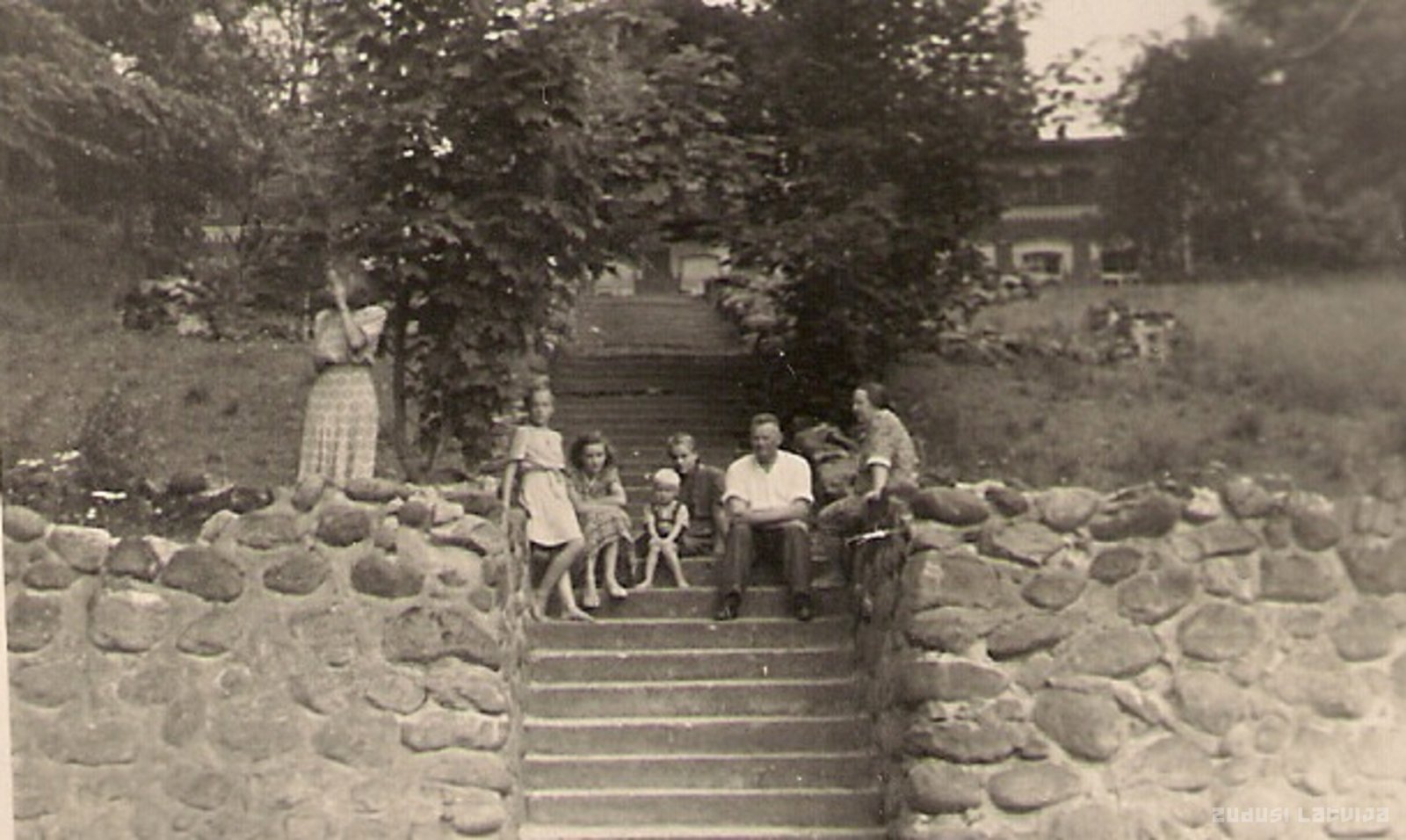 Skats no Salacas puses, kāpnes uz Vīķu muižu. No labās puses skolotāja A. Martinsone un A. Martinsons