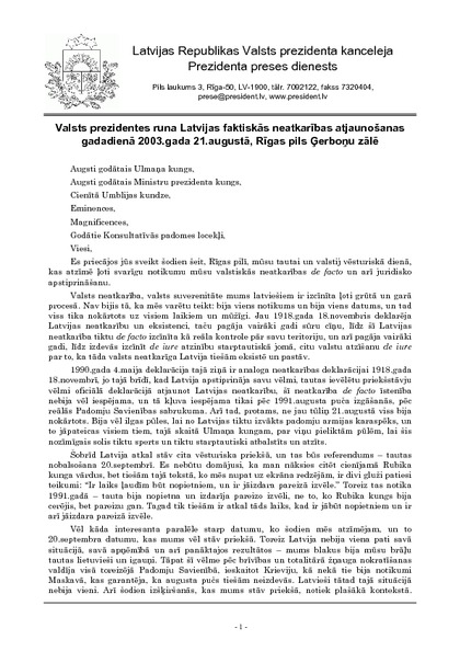 Valsts prezidentes runa Latvijas faktiskās neatkarības atjaunošanas gadadienā 2003.gada 21.augustā, Rīgas pils Ģerboņu zālē