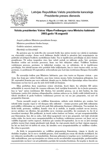 Valsts prezidentes Vairas Vīķes-Freibergas runa Ministru kabinetā 2003.gada 19.augustā