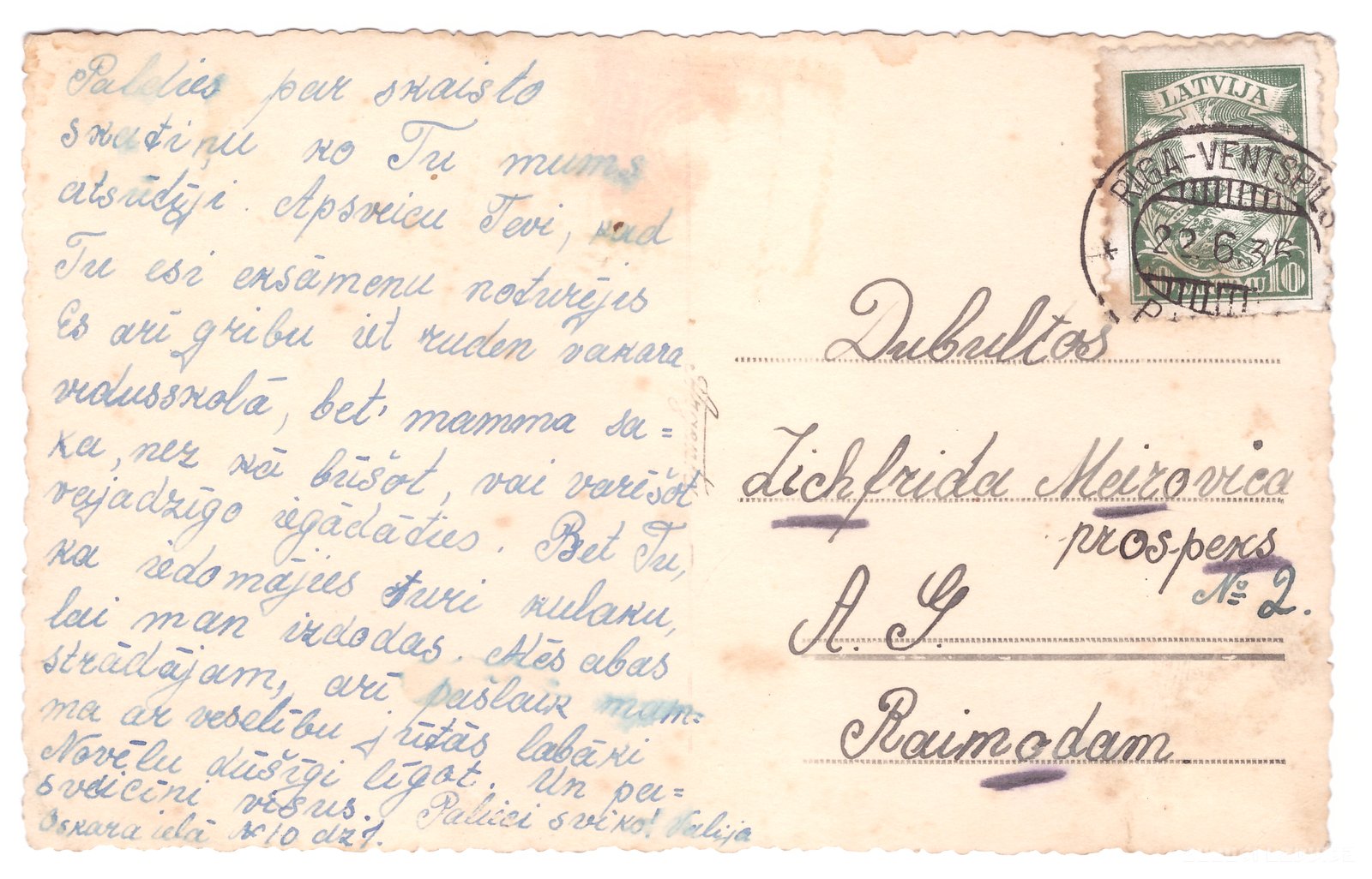 Fotogrāfija kopā ar neskaitāmām citām atradās Poruka ielā 10 un adresēta Raimondam Sīpolam (miris Austrālijā, mainīja uzvārdu uz Celms), kurš bija audžubērns Angelinai Celms un Žanim Celms. Tās saglabāja Milda Margrieta Kleinhofs pēc tā, kad ģimene daļēji devās emigrācijā 1944.gadā uz Vāciju atstājot visu kas tai piederēja Latvijā. Milda emigrācijā nedodas. Ģimenes mājā 1944. gadā sāk dzīvot Augusts Kirhenšteins un viss tiek atņemts. Arī šī fotogrāfija tika "izzagta" no pašas ģimenes mājas