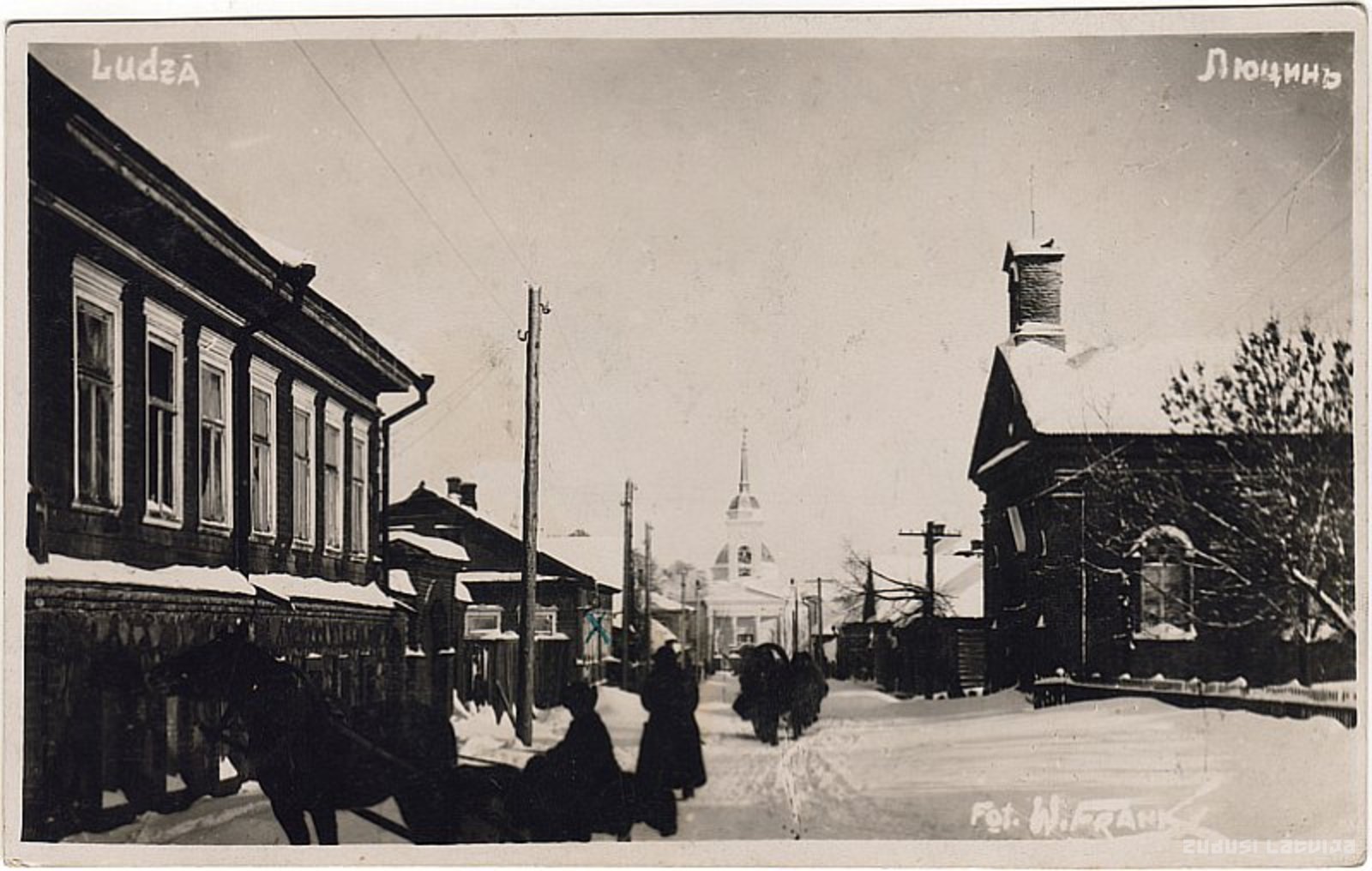 Attēlā redzama Latgales iela. Tā savu nosaukumu laika gaitā ir mainījusi vairākkārt; tas, protams, ir saistāms ar varas maiņām Latvijas teritorijā. Līdz 1917.gadam iela tika dēvēta Aleksandra vārdā, pēc tam - Rēzeknes vārdā. Kopš apvienoja divas ielas kopā, to dēvē par Latgales ielu. Attēlā redzamā apbūve (atskaitot pareizticīgo dievnamu) līdz mūsdienām nav saglabājusies. Pareizticīgo Dievmātes aizmigšanas katedrāle tika celta no 1843. līdz 1845.gadam pēc arhitekta A. Zaharova projekta vēlā krievu klasicisma stilā pēc tipveida projekta. Baznīca savulaik atradās Ludzas pilsētas centrā (mūsdienās – vecpilsētas centrā), tā ir celta krusta formā ar Toskānas ordeņa kolonām. Jau 1863.gadā baznīca bija praktiski avārijas stāvoklī, tādēļ tika veikts vajadzīgais remonts. 1878.gadā dievnams ieguva katedrāles nosaukumu. No 1900. līdz 1901.gadam tika veikta katedrāles pārbūve - kupols tika pacelts par 8 m augstāk, zvanu tornis – par 4 m. 1906.gadā par draudzes locekļu saziedotajiem līdzekļiem zvanu tornī novietoja 1667 kg smagu zvanu. 1938.gadā Vasaras svētku sestdienā Ludzā plosījās liels ugunsgrēks, kura laikā cieta arī katedrāle - aizdegās katedrāles kupols un no tā nogāzās krusts, taču ugunsgrēka sekas bija novērstas līdz tā paša gada Jaunavas Marijas svētkiem 15.augustā. Pašlaik dievnama telpas tiek restaurētas.