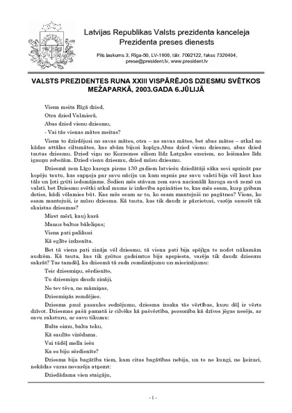 VALSTS PREZIDENTES RUNA XXIII VISPĀRĒJOS DZIESMU SVĒTKOS MEŽAPARKĀ, 2003.GADA 6.JŪLIJĀ