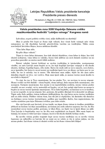 Valsts prezidentes runa XXIII Vispārējo Dziesmu svētku mazākumtautību festivālā “Latvijas vainags” Kongresu namā