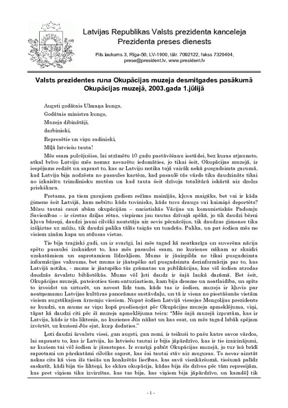 Valsts prezidentes runa Okupācijas muzeja desmitgades pasākumā Okupācijas muzejā, 2003.gada 1.jūlijā
