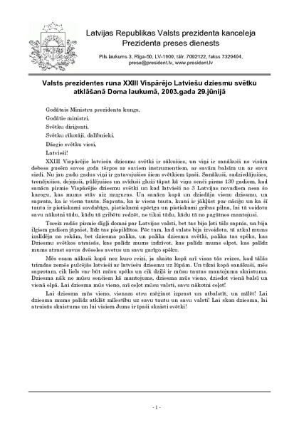 Valsts prezidentes runa XXIII Vispārējo Latviešu dziesmu svētku atklāšanā Doma laukumā, 2003.gada 29.jūnijā