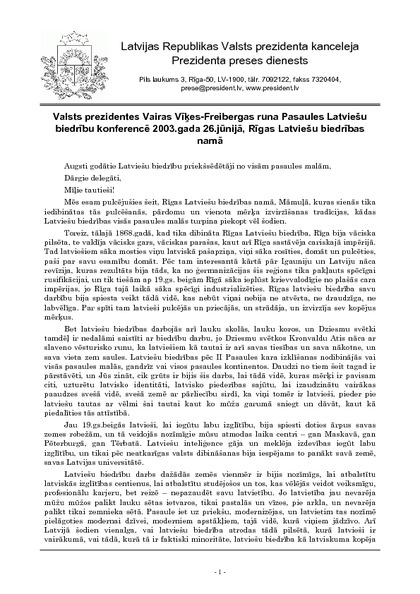 Valsts prezidentes Vairas Vīķes-Freibergas runa Pasaules Latviešu biedrību konferencē 2003.gada 26.jūnijā, Rīgas Latviešu biedrības namā