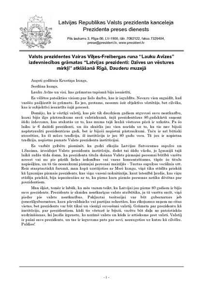 Valsts prezidentes Vairas Vīķes-Freibergas runa “Lauku Avīzes” izdevniecības grāmatas “Latvijas prezidenti: Dzīves un vēstures mirkļi” atklāšanā Rīgā, Dauderu muzejā