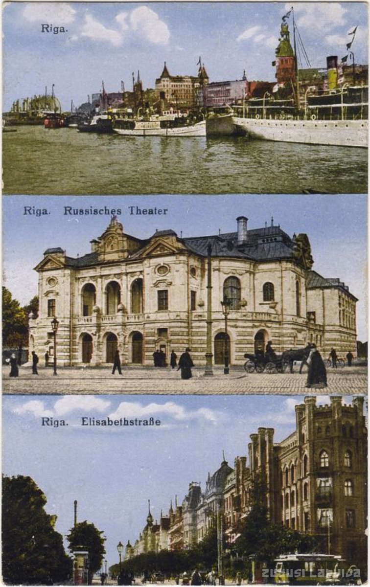Atklātnes vidusdaļā skats uz Pilsētas II (Krievu) teātri (tagad Nacionālo teātri), kas uzcelts (1900-1902) pēc arhitekta A. Reinberga projekta. Fasādi dekorējis tēlnieks A. Folcs. Atklātnes trešajā daļā redzama Elizabetes iela sākot no Pulkveža Brieža ielas. Ielas stūrī redzams Tīzenhauzena īres nams, celts 1888.g. neogotikas stilā, arhitekts Edmunds fon Trompovskis.