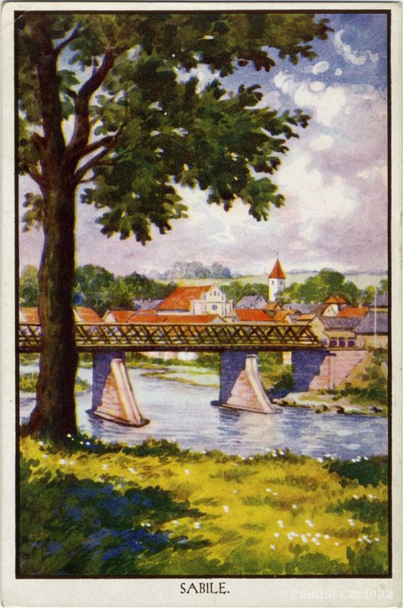 Sabile atrodas Abavas senlejas krastos. Pirmoreiz minēta 1253. g., pilsētas tiesības kopš 1917.g. Jau daudz agrāk par 1253. gadu te pastāvējusi nocietināta kuršu pils ar senpilsētu. Apmēram XIII - XIV gs. mijā vācu feodāļi šeit uzcēla savu pili, pie kuras 1462. gadā minēts miests. Sabilē attīstījās tirdzniecība un amatniecība, XVII gs. darbojās manufaktūras (linu austuve, kaļķu ceplis, darvas tecinātava, dzirnavas). Uz ZR no vecās, senatnīgās pilsētas daļas atrodas Jaunsabile, bet no tās vēl apmēram 3 km lejup upē ir 2 m augsts dolomīta slieksnis, kas veido ūdenskritumu - Abavas rumbu. Pilsētas vēsturiskais centrs ir 15.-19. gs. pilsētbūvniecības piemineklis. Vairākas teikas vēstī, ka Sabiles pilsētas nosaukums cēlies no ripojoša zvana skaņām. Labajā pusē redzams Sabiles luterāņu baznīcas tornis. Priekšplānā tilts pār Abavu kurš savieno Sabiles centru un tā saukto Pārabavu. Betona tilts celts 1956. gadā, bet pirms šī tilta Sabilē bijuši vēl vairāki tilti. Ir pieejami dati par tiltu 1929. gadā, kad pāļi bija sadzīti, betona balsti pārsedzēm un abos tilta galos uzcelti. Pārējā tilta būvniecībā tika izmantota koksne, tā tika uzcelts otrais koka tilts pār Abavu, bet uz betona balstiem. Līdz 1950. gadam tilta koka pārsedžu daļas bija nolietojušās un daudzkārt remontētas, tāpēc tika izskatīts jautājums par tilta remontu, ko pabeidza 1956. gadā.