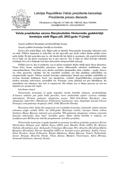 Valsts prezidentes uzruna Starptautiskās Vēsturnieku gadskārtējā komisijas sēdē Rīgas pilī, 2003.gada 11.jūnijā