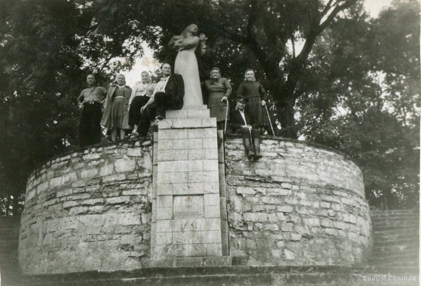 Ekskursanti no Jelgavas Vīgantes parkā pie skulptūras ''Daina''. Pirmais no kreisās Visvaldis Sproģis