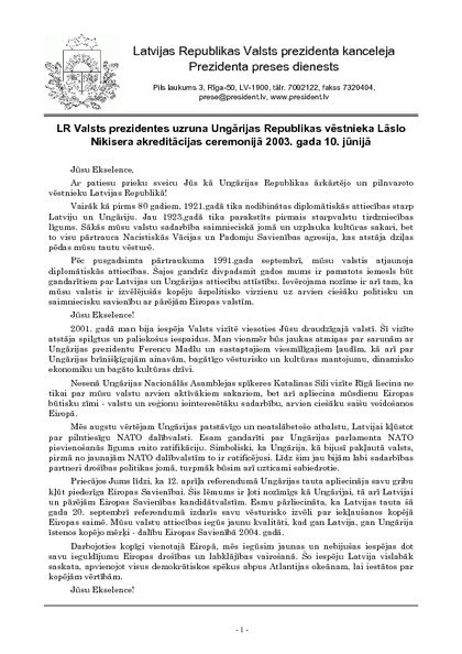 LR Valsts prezidentes uzruna Ungārijas Republikas vēstnieka Lāslo Nikisera akreditācijas ceremonijā 2003. gada 10. jūnijā