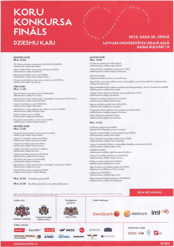 Koru konkursa fināls : dziesmu kari, 2018. gada 30. jūnijā, Latvijas Universitātes Lielajā aulā : [afiša]