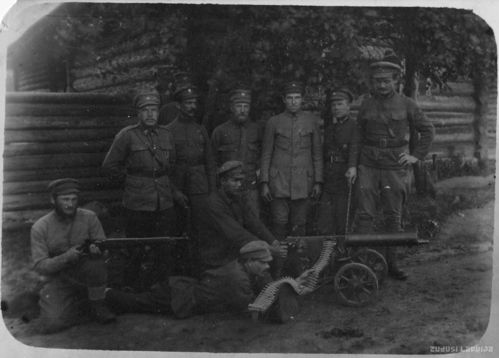 Brīvības cīņu dalībnieki. 1920. gada. 25. jūnija naktī Latgalē, Kapteinis Pēteris Ozoliņš, kopā ar 6. Rīgas kājnieku pulka izlūku nodaļu niknā, nežēlīgā cīņā izsita ienaidnieku no Kreņevas, Butanovas un Jurčatku sādžām, iegūdams kā trofeju ložmetēju kaujas gatavībā. Pirmais no labās puses kājās, Lāčplēša Kara ordeņa kavalieris kapteinis Pēteris Ozoliņš, otrais Lāčplēša Kara ordeņa kavalieris virsseržants, vada komandieris Jānis Reingolds