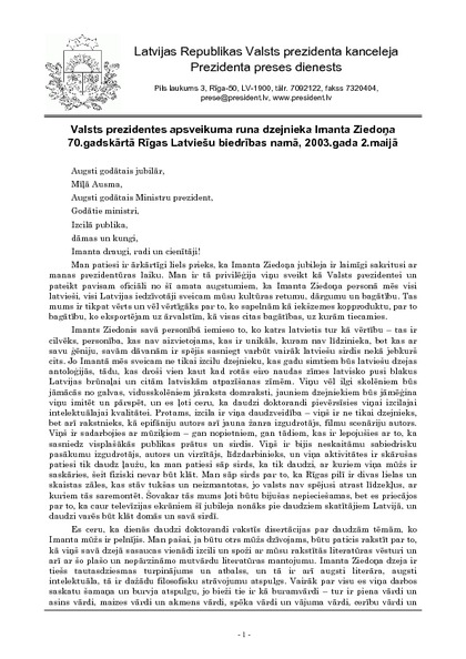 Valsts prezidentes apsveikuma runa dzejnieka Imanta Ziedoņa 70.gadskārtā Rīgas Latviešu biedrības namā, 2003.gada 2.maijā