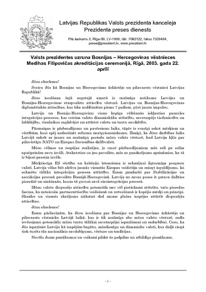 Valsts prezidentes uzruna Bosnijas – Hercegovinas vēstnieces Medihas Filipovičas akreditācijas ceremonijā, Rīgā, 2003. gada 22. aprīlī