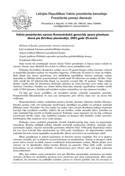 Valsts prezidentes uzruna Komunistiskā genocīda upuru piemiņas dienā pie Brīvības pieminekļa, 2003.gada 25.martā