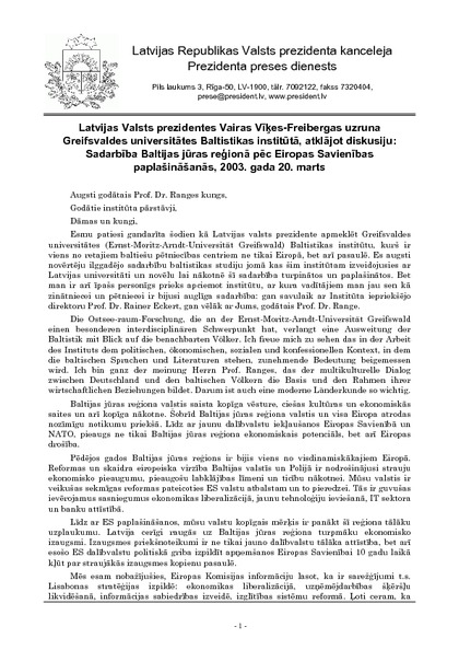 Latvijas Valsts prezidentes Vairas Vīķes-Freibergas uzruna Greifsvaldes universitātes Baltistikas institūtā, atklājot diskusiju: Sadarbība Baltijas jūras reģionā pēc Eiropas Savienības paplašināšanās, 2003. gada 20. marts