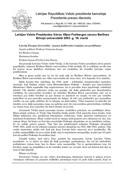 Latvijas Valsts Prezidentes Vairas Vīķes-Freibergas uzruna Berlīnes Brīvajā universitātē 2003. g. 18. martā