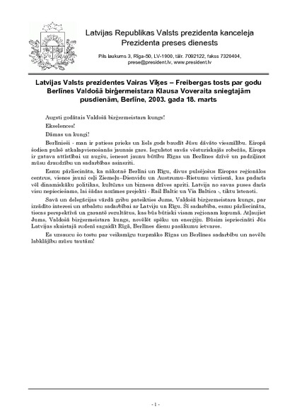 Latvijas Valsts prezidentes Vairas Vīķes – Freibergas tosts par godu Berlīnes Valdošā birģermeistara Klausa Voveraita sniegtajām pusdienām, Berlīne, 2003. gada 18. marts