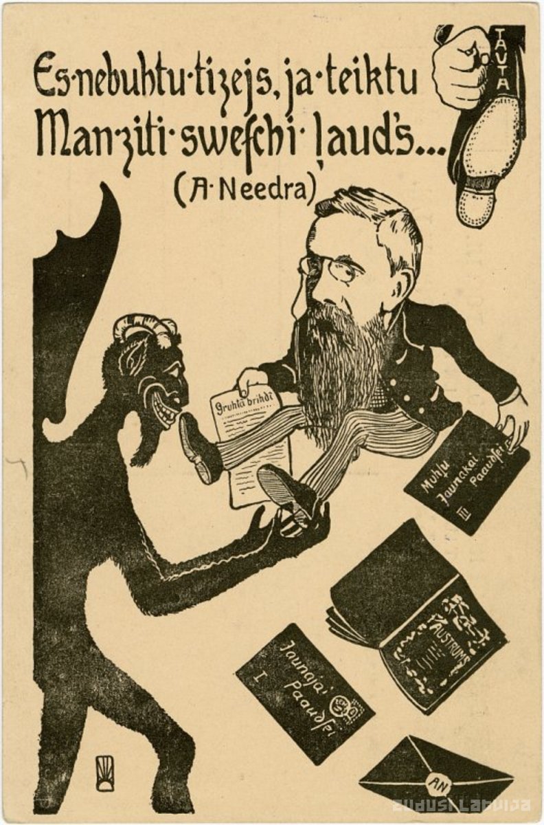 Atklātne ar karikatūru par Niedras valdību I Pasaules kara laikā Latvijas teritorijā.