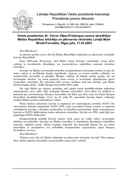Valsts prezidentes Dr. Vairas Vīķes-Freibergas uzruna akreditējot Maltas Republikas ārkārtējo un pilnvaroto vēstnieku Latvijā Mark Miceli-Farrudžia, Rīgas pils, 11.03.2003