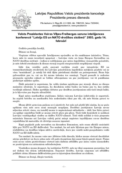 Valsts Prezidentes Vairas Vīķes-Freibergas uzruna inteliģences konferencē “Latvija ES un NATO drošības sistēmā” 2003. gada 14. februārī