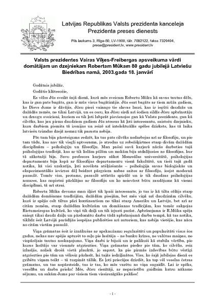 Valsts prezidentes Vairas Vīķes-Freibergas apsveikuma vārdi domātājam un dzejniekam Robertam Mūkam 80 gadu jubilejā Latviešu Biedrības namā, 2003.gada 18. janvārī