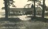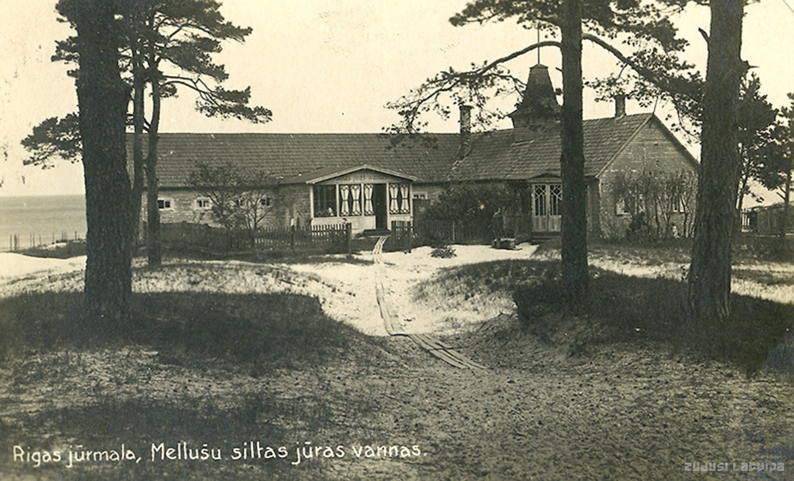 Kūrmāja Mellužu jūrmalā, kāpās. Virs ieejas uzraksts "Siltas jūras vannas". Aiz ēkas redzama pludmale un jūra. Priekšplānā priedes un no dēļiem izlikta laipa.