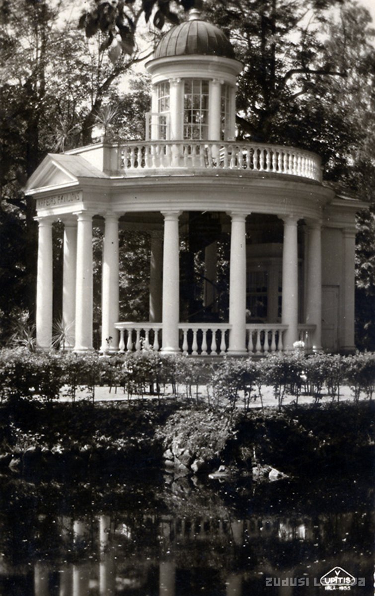 Kafijas paviljons Ķemeru parkā. Paviljons – rotonda ir viens no Ķemeru parka arhitektūras izteiksmīgākajiem objektiem un atrodas uz mākslīgi izveidotās „Mīlestības saliņas” Vēršupītes krastā. Jau kopš 19.gs. beigām te atradās kokgriezumiem bagātīgi rotāts paviljons, kas nopostīts I Pasaules kara laikā. Tagadējā mūra rotonda uzcelta 1928. gadā pēc arhitekta Fridriha Skujiņa projekta. Te atradās kafijas paviljons, kur kūrorta viesiem piedāvāja bezalkoholiskos dzērienus, tēju un kafiju ar uzkodām. Izklaidei bija uzstādīts radio. Tepat bija iespējams izīrēt laiviņas, lai vizinātos pa Vēršupīti un kanālu sistēmu. Padomju laikā pie „Mīlestības saliņas” notika Bērnības svētki.