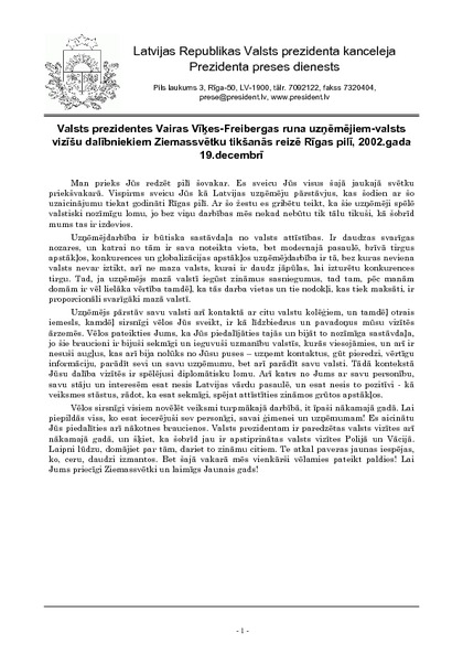 Valsts prezidentes Vairas Vīķes-Freibergas runa uzņēmējiem-valsts vizīšu dalībniekiem Ziemassvētku tikšanās reizē Rīgas pilī, 2002.gada 19.decembrī