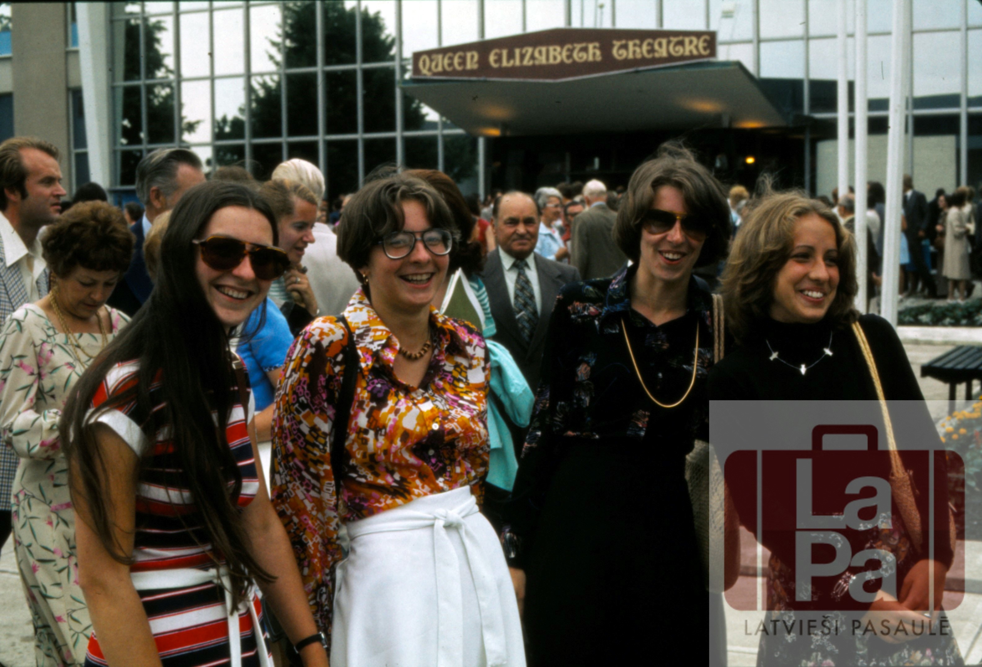 Ņudžersijas latvietes – teātra publika. No kreisās: Gunta Bierne, Zinta Bierne, Maira Bierne, nezināms. Teātrī Queen Elizabeth 6. Dziesmu svētku laikā tika uzvesta Raiņa luga "Rīgas ragana". Lugu uzveda Toronto latviešu teātra aktieri, režisors O. Uršteins, scenogrāfs Ē. Dajevskis.