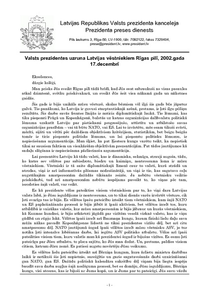 Valsts prezidentes uzruna Latvijas vēstniekiem Rīgas pilī, 2002.gada 17.decembrī