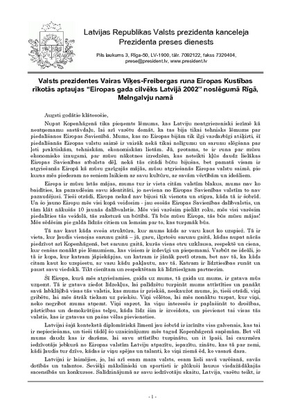 Valsts prezidentes Vairas Vīķes-Freibergas runa Eiropas Kustības rīkotās aptaujas “Eiropas gada cilvēks Latvijā 2002” noslēgumā Rīgā, Melngalvju namā