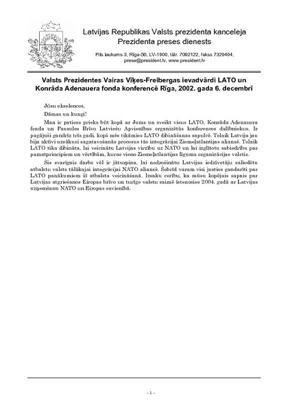 Valsts Prezidentes Vairas Vīķes-Freibergas ievadvārdi LATO un Konrāda Adenauera fonda konferencē Rīga, 2002. gada 6. decembrī