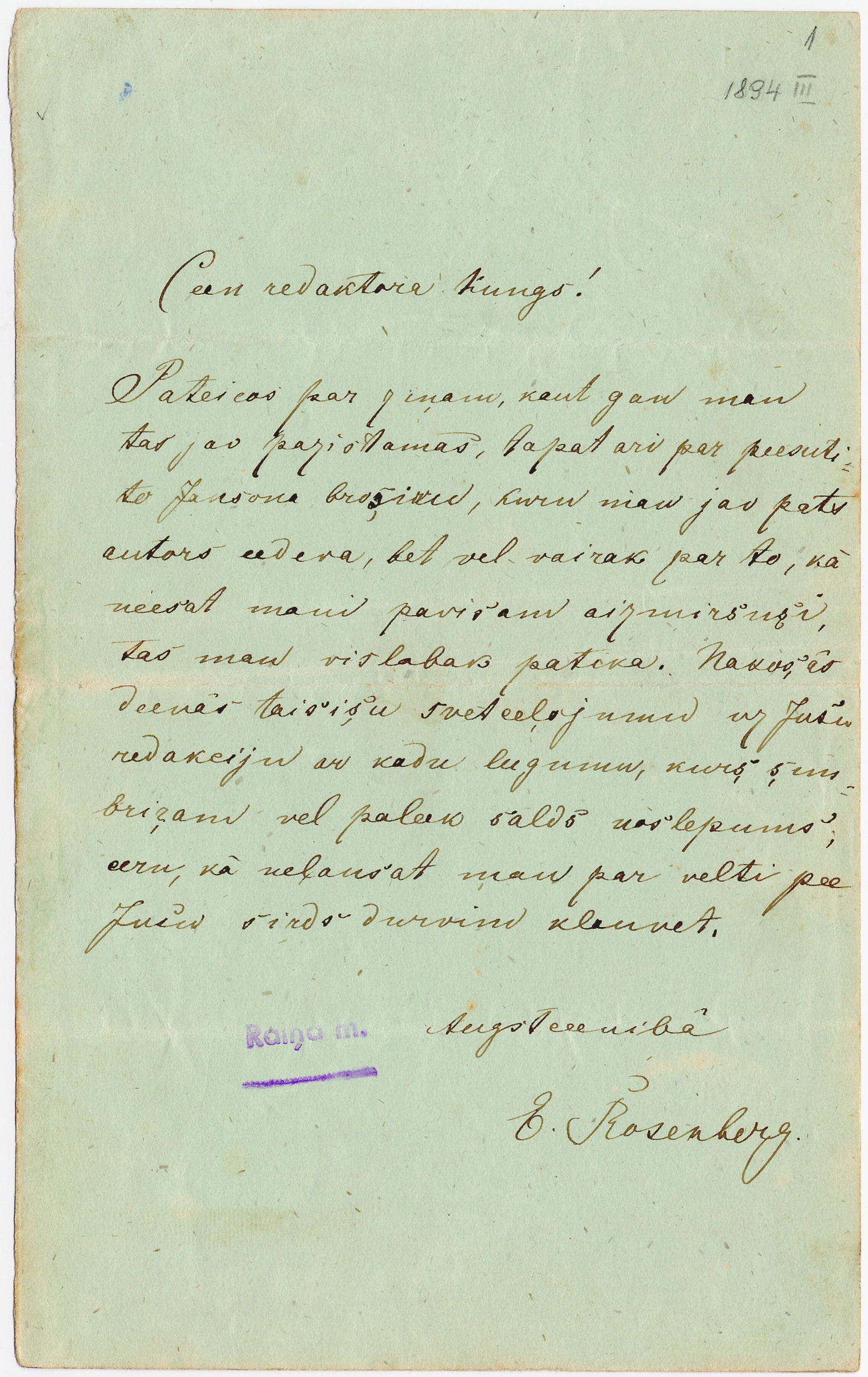 Vēstule. Aspazija - Rainim ("Dienas Lapas" redakcijā). 1894. gada aprīļa sākums. 1 lp. rokr. ar tinti.