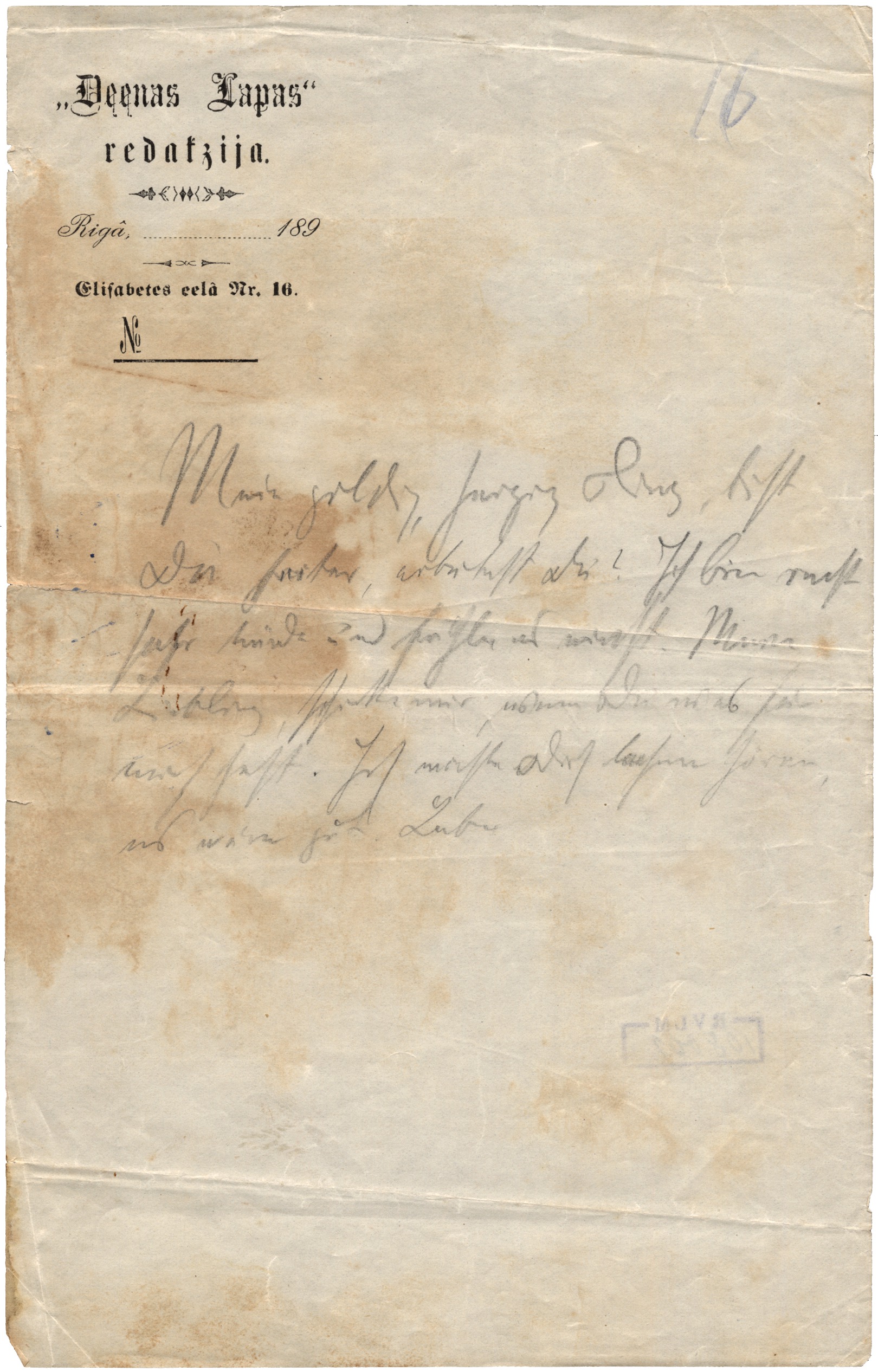 Vēstule. Rainis - Aspazijai. Rīga. 1894. gada maijs. 1 lpp. vācu val. uz Dienas Lapas redakcijas veidlapas. Locījumi, brūni traipi.