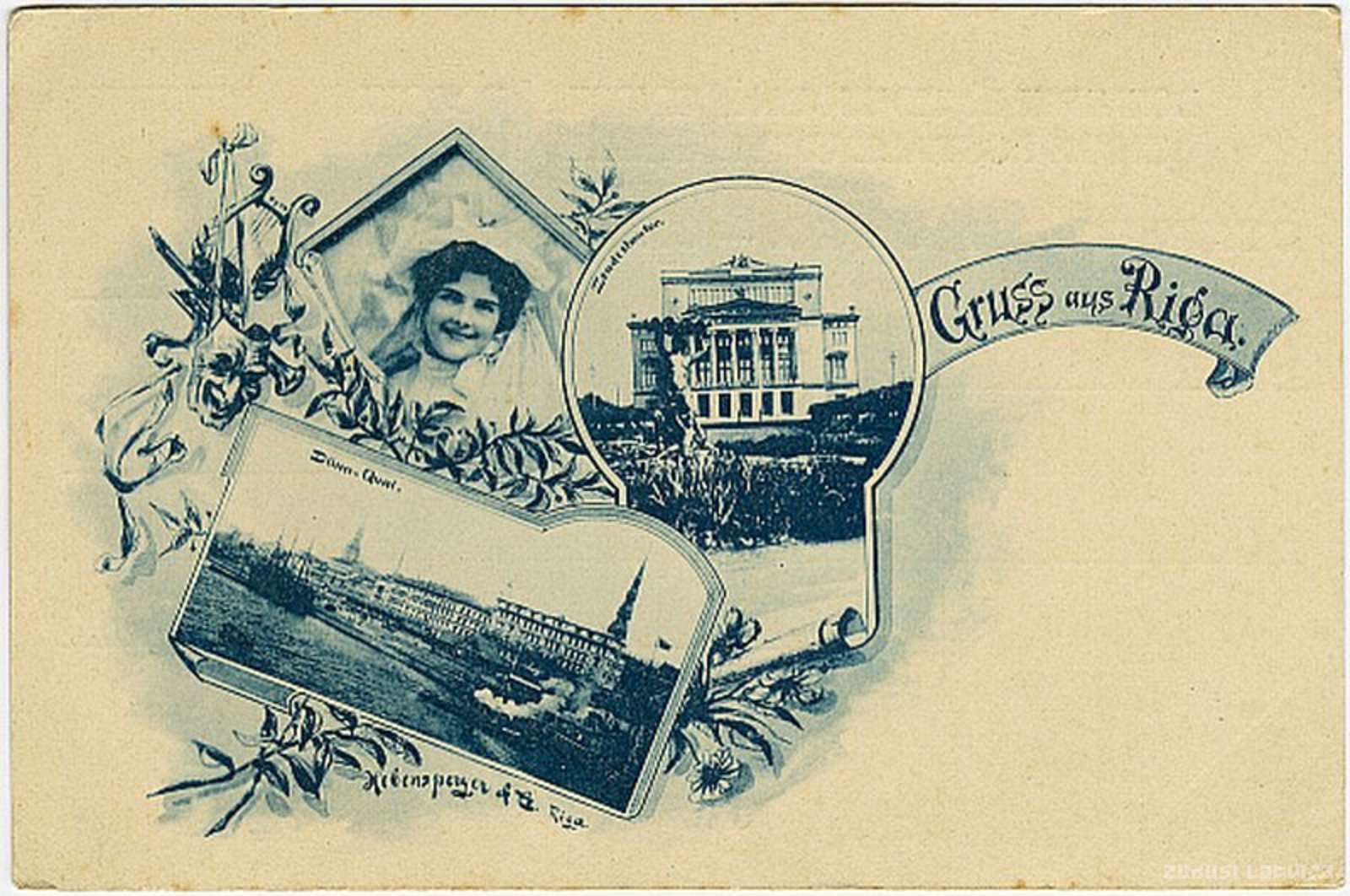Kolāža no 3 attēliem: Daugavas krastmala, sievietes portrets, Rīgas pilsētas teātris (tagad: Latvijas Nacionālā opera)