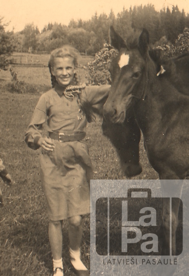 Zigrīda Daškevica Latvijā 1940. gadā. Fotogrāfijas otrā pusē: "Dzeltens manis kumeliņš. 1940. g. aug." Fotogrāfija ņemta līdzi emigrējot uz Lielbritāniju.