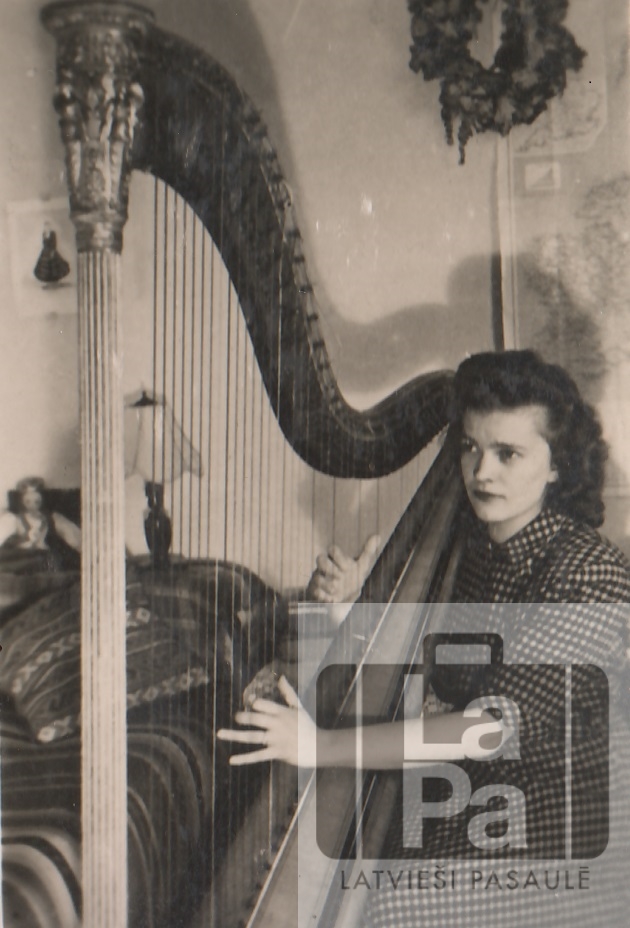 Zigrīda Daškevica spēlē arfu. Fotogrāfijas otrā pusē: "Anglijā 1948. g.?"