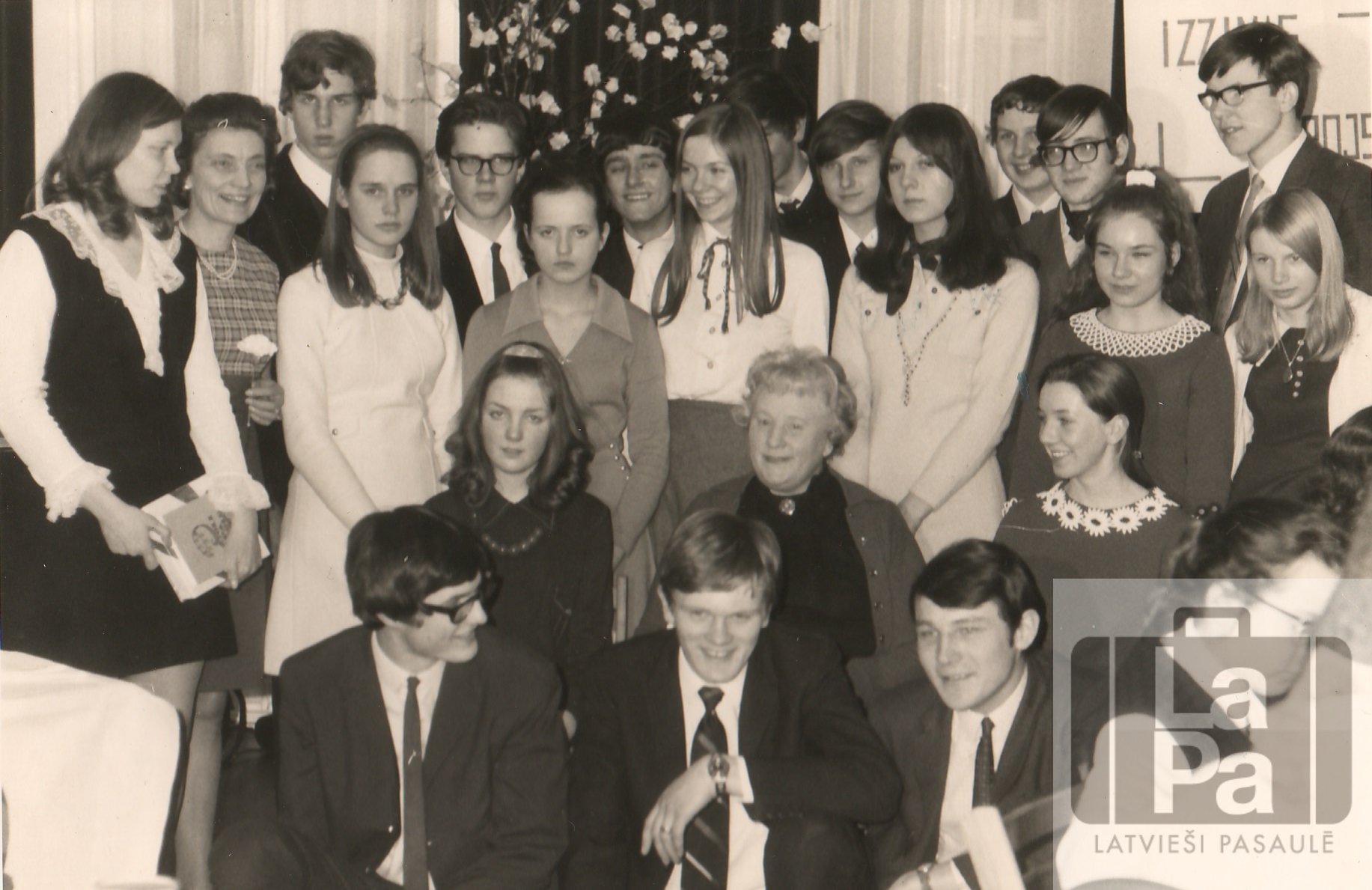 Daugavas Vanagu fonda Londonas nodaļas tautas deju kopa "Metieniņš" 1969. gada gadskārtējā pavasara sarīkojumā. Goda viesis – Vera Rulliņa. DVF namā Londonā.